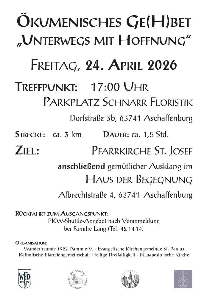 Das Ge(h)bet ist eine gemeinsame Aktion der Wanderfreunde 1922 Damm e. V., der Neuapostolischen Kirche, der katholischen Pfarrgemeinde Heilige Dreifaltigkeit und der evangelischen St. Paulusgemeinde. Im Anschluss laden wir zu einer Rast im Haus der Begegnung ein. (Albrechtstr. 4, neben der St.-Josef-Kirche).